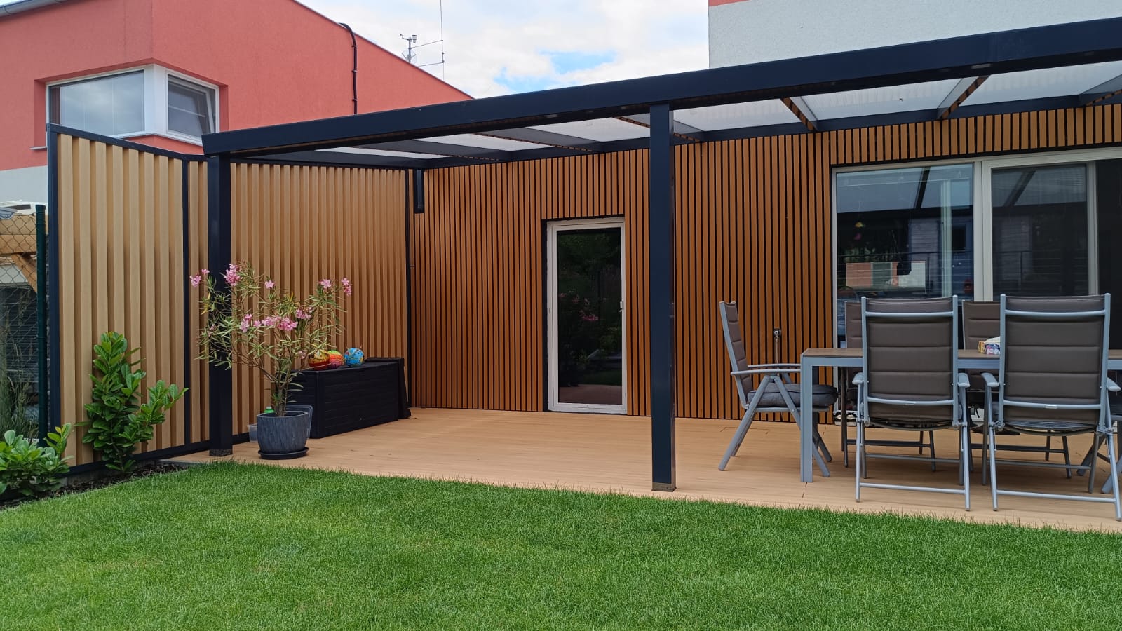 - Vzhled dřeva bez jeho slabin (nešedne, netvoří třísky)